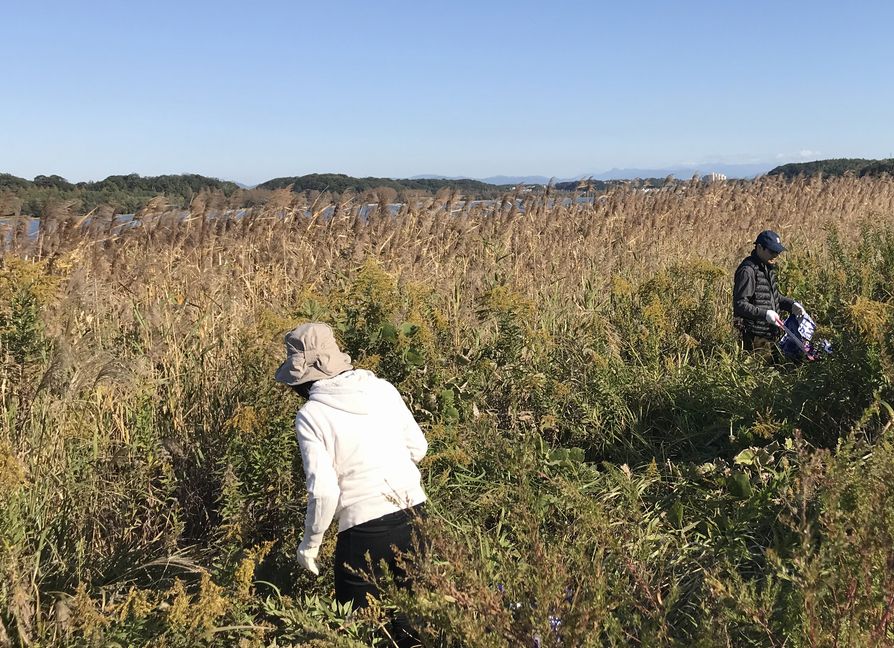 スタート地点近くはまだ葦が伸びていて、中に入っての活動です。