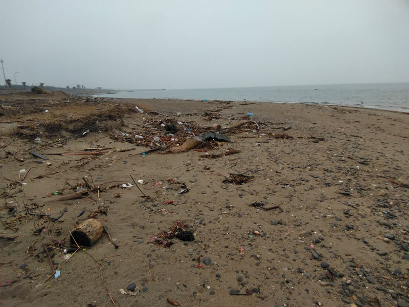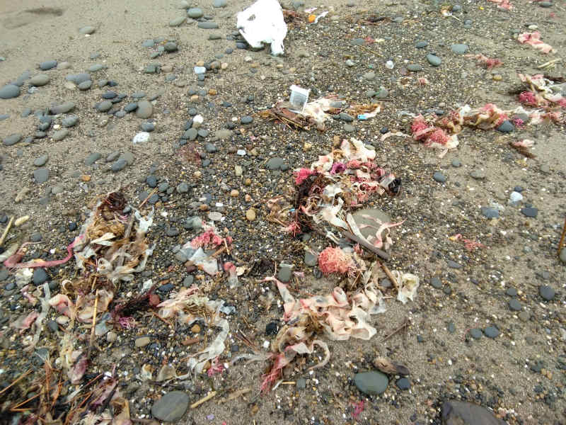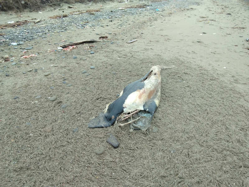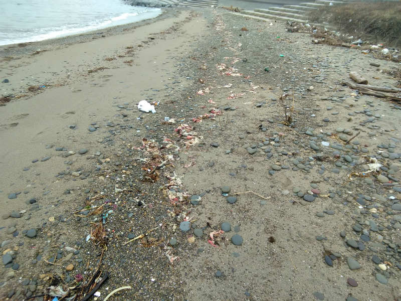 浜に降りると、朱い海藻が打ち上げられていました。そして、その先には砂に埋まったスナメリの死体がありました。