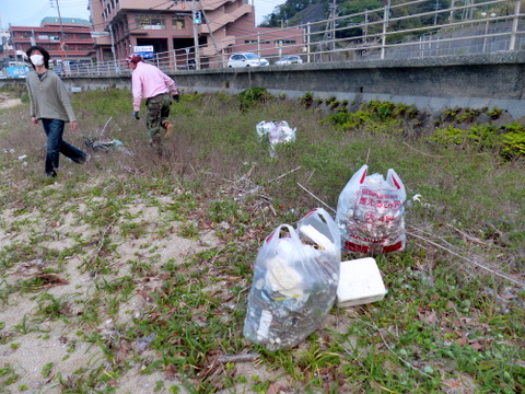 今日は,14:30〜19:00までゴミ拾いをしました。一番端から5mと範囲を決めて,まず,雑草を刈った後,とりあえず切った雑草を集めて,海岸下の方に向かってローリングしながら少しずつゴミを取っていきました。大変な作業でしたが,終わってみると綺麗になった場所が喜んでいるようで嬉しくなりました。今日は,散歩中の方も参加されて3人でのゴミ拾いとなりました!とっ〜ってもいい方で心が温かくなりました。