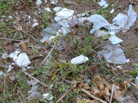 細かく散財している発泡スチロールやビニール,プラ製の小さな粒々。一つ一つを取り除くのが大変なので,最後は,砂や土と一緒に集めることにしました。