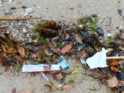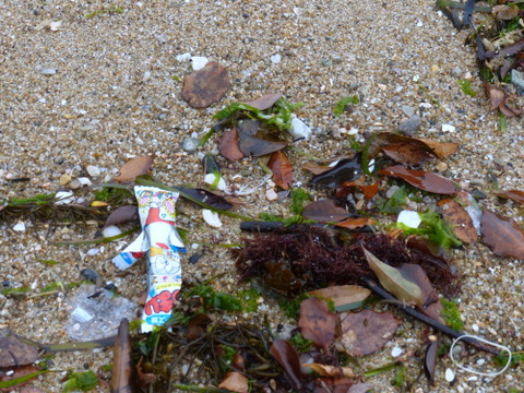 お菓子の袋と海藻が絡み合って,取るのに一苦労。