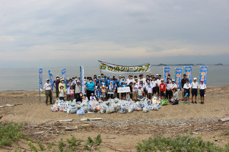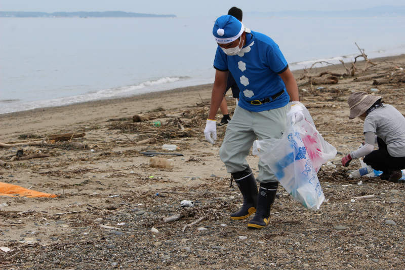 毎月行っている西の浜クリーンアップ活動。今回は、海の日に合わせての活動です。ブルーサンタも登場。東三河農林水産事務所との協働活動です。