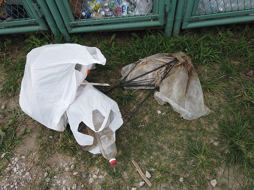 袋4袋(燃えるゴミ2袋+燃えないゴミ2袋)と壊れた傘2本。
