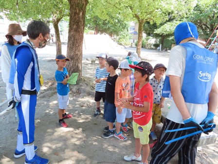夏仕様のゴミブルーにこどもたち興味津々。