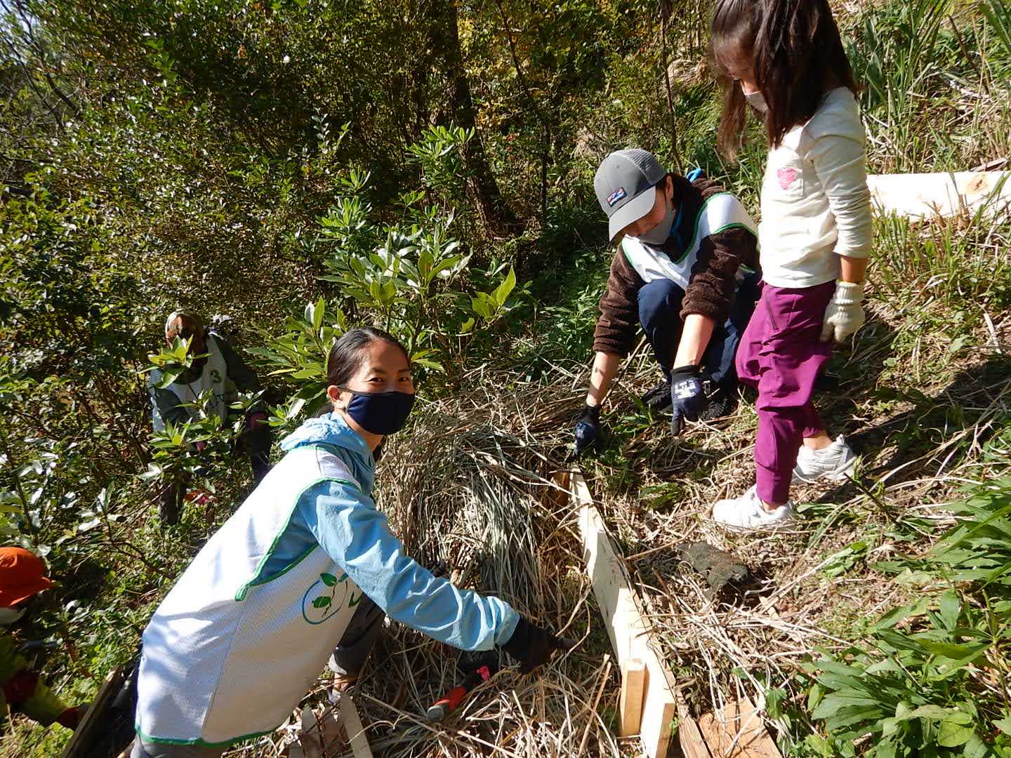 その後は、補植を行う別の植樹地にて、倒れてしまった土留板を直しました。雨が降っても、栄養のある土が流れてしまわぬように土留をすることは、土壌生物の多様性を増す大切なきっかけ作りです。 枯れ枝からノコギリで木の杭を作って、トンカチで打ち込むなど力仕事たっぷりでしたが、みんな力強く、手際よく作業してくださいました。チームワークもばっちりです♫