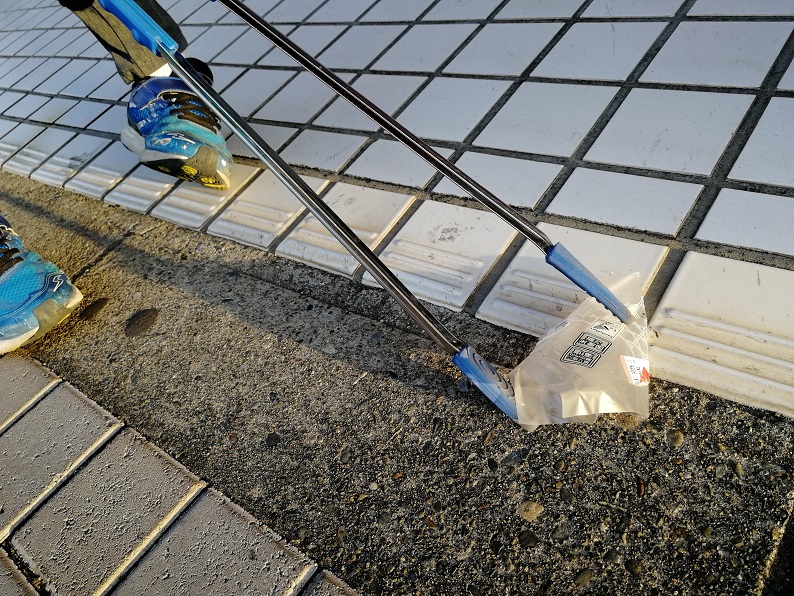 昨日、市役所でもらってきた緑のごみ袋を持って、ごみさん。