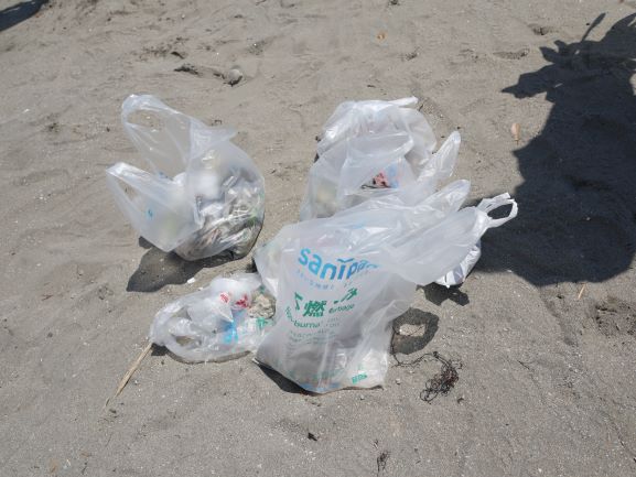 波打ち際のゴミはプラスチックの細かい破片が非常に多く、拾っても拾ってもキリがない・・・