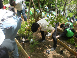 各班の植樹リーダーに植え方の指導をいただきながら、