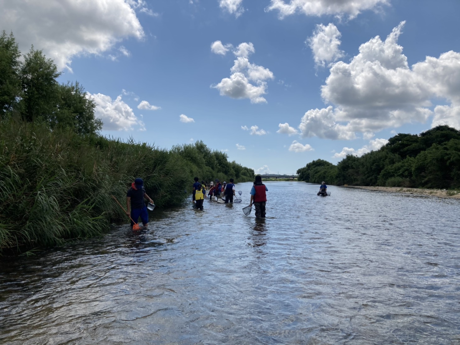魚とりは、日に日に頼もしくなっているキッズクラブが活躍しました。オイカワやカワムツ、タカハヤ、シマドジョウなど、鈴鹿川らしい魚がたくさんとれました。そして、秘密の水路を発見した幹部メンバーは大きなナマズを捕獲し、ヒーローになりました。途中から泳ぎながら魚を見たり、捕まえたりしているメンバーもいました。自然と距離が近いというのはいいことですね♪