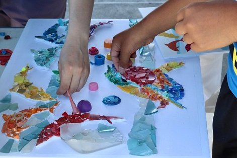 小さな子供たちも率先して色とりどりのごみを使い、イルカを作っていきます。