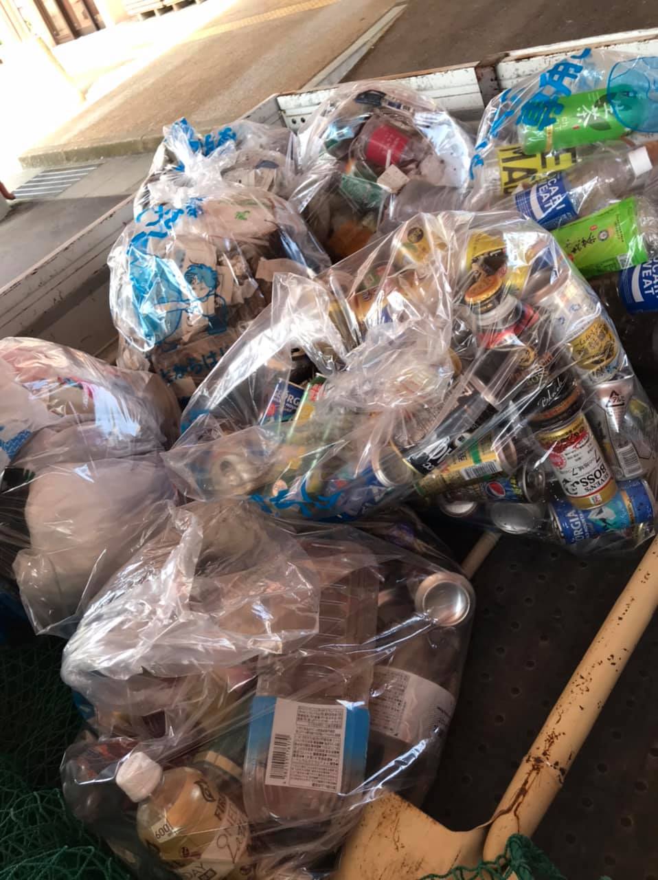 丁寧にレジ袋にまとめた弁当容器、ペットボトルや空箱など