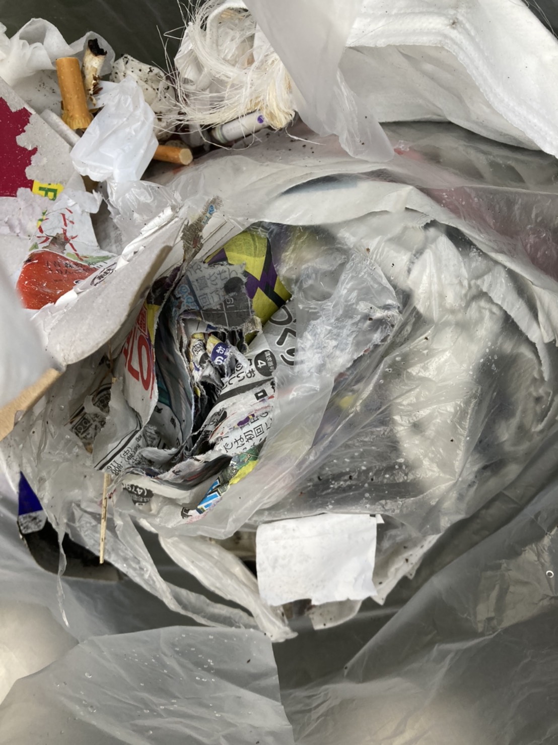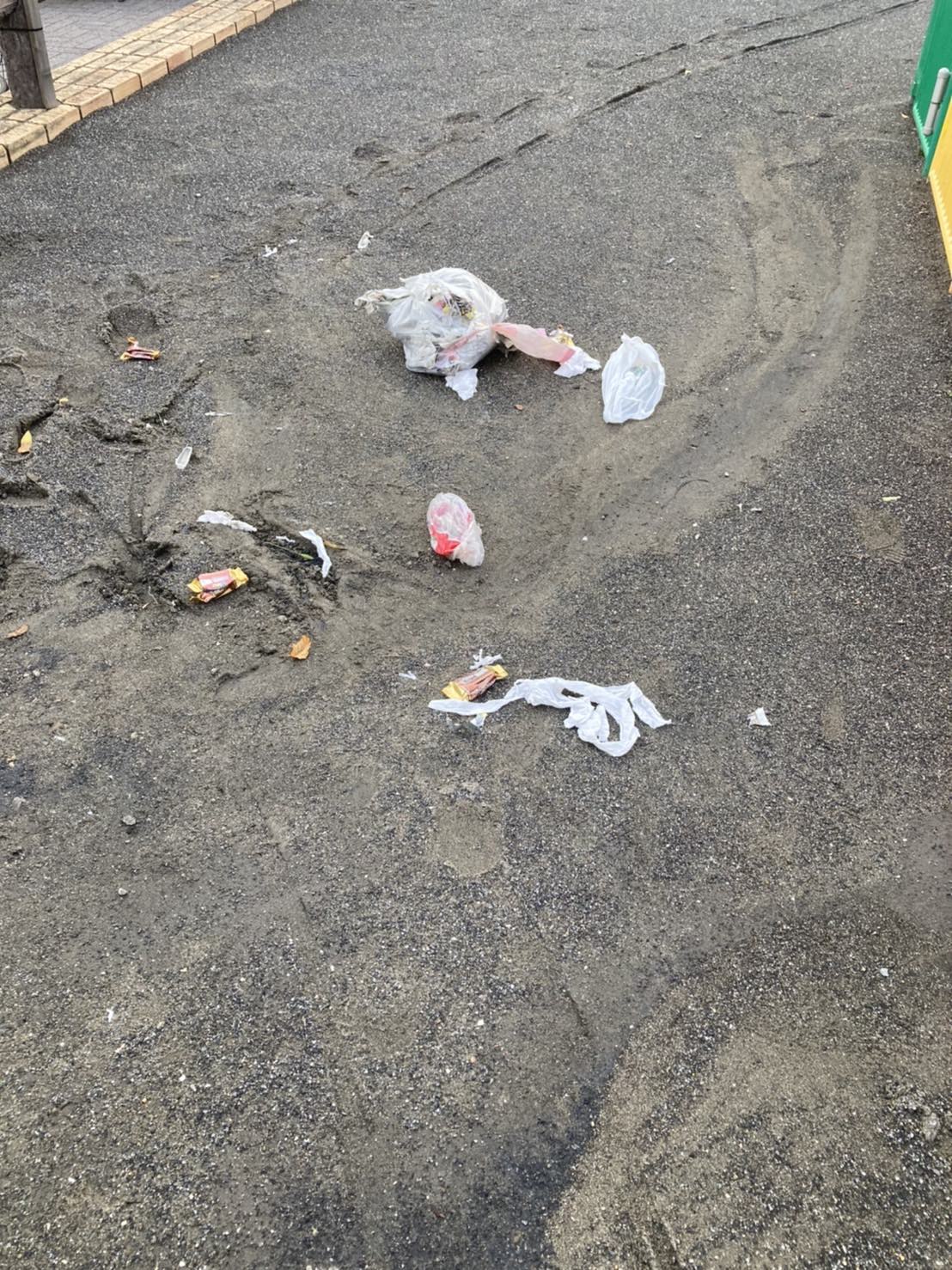 公園のベンチ前にビニール袋に詰めた新聞紙が放置されていて、カラスに荒らされたのか散乱していました。