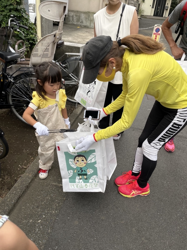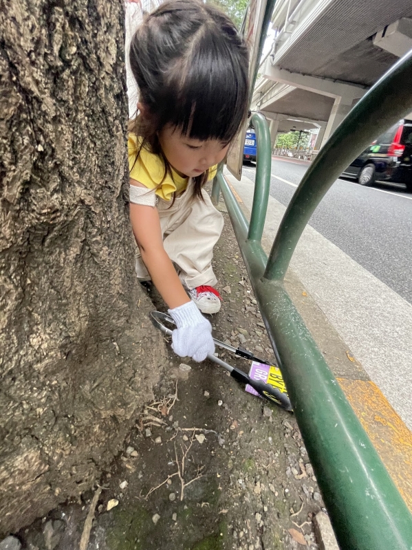街いく探検隊のルールとして、大人はガービッジバッグを持ちます。可燃、不燃、ペットボトル、ビンカン、金属それぞれのバッグを持ち、子ども隊員が拾ったゴミの分別をサポートしながら共同作業でゴミを回収していきます。こうすることで、黙々と拾いがちの清掃活動ですが、声がけしながら共同作業として行います。学生隊員も子ども達にやさしくサポートしながら頑張ってくれました!