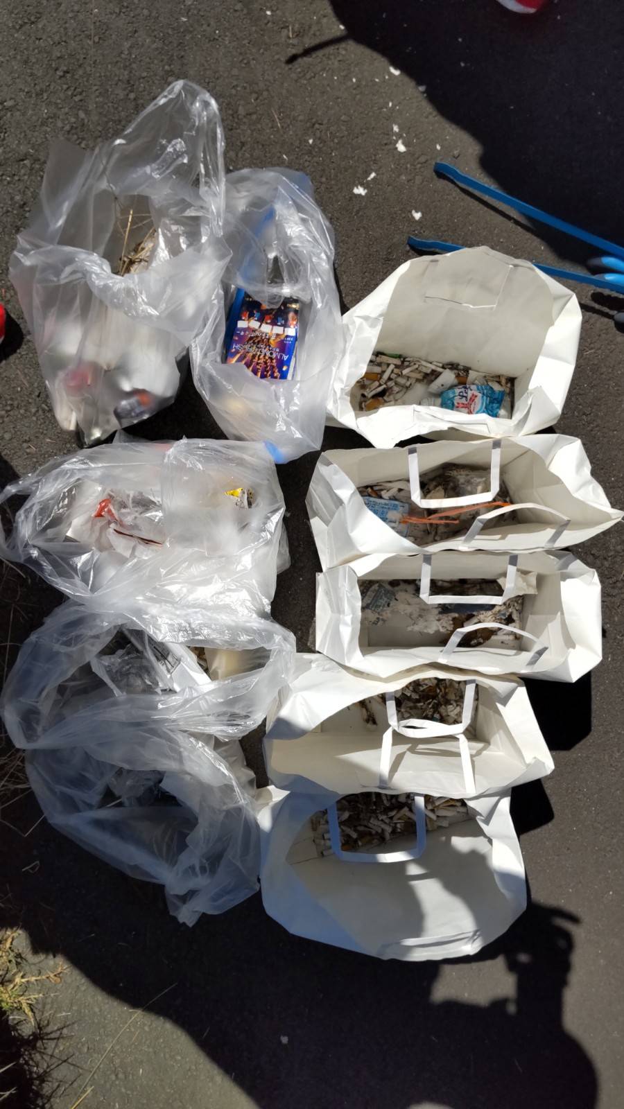 私たちは町内のごみ拾いをメインに、老人会の方は道端の草刈りをメインに一緒に清掃活動を約2時間実施しました。日差しが強く汗をかく中での活動でしたが、2ヶ月ぶりの活動でいつもの道には「吸い殻」が一杯?