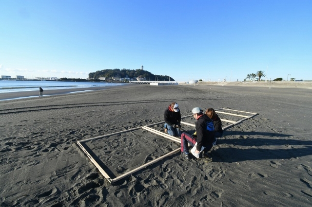 砂のうえに描かれる海の生き物は、ゴミ拾いをしていて、海の中を想像するキッカケになります。