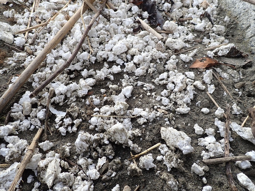 カラスにつつかれたからか、発泡スチロールが細かく砕けてポップコーンのように…w