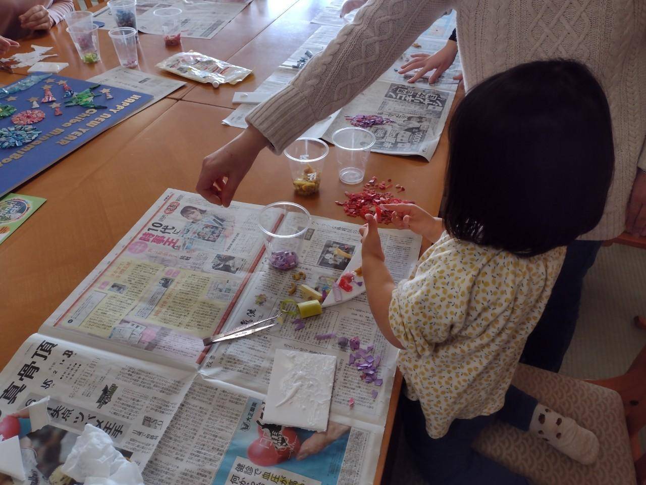 カラフルな細かいプラごみを、ピンセットを使って下絵に貼りつけていきます。