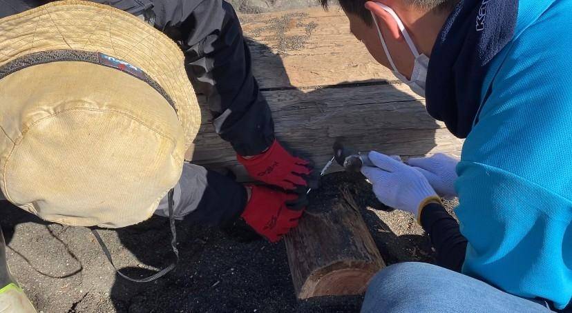 今回、前もって自然の家のスタッフさんと打ち合わせをしており、流木を使ったベンチづくりをしたいとの声もあって、後半は海岸でベンチづくり組とホテルでアートづくり組とわかれて作業をしました。
