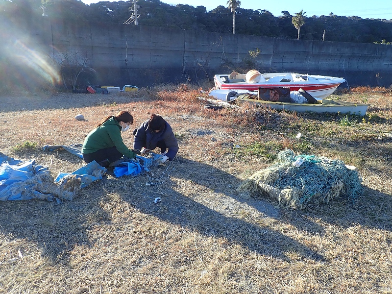 ビーチクリーン後は、前回までの活動の際に回収し、これまで雨ざらしにして砂を落としていた漁網のかたまりなどをバラしていく作業!!