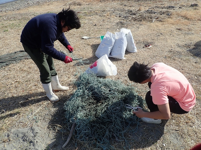 後半は、前回の続きで漁網のかたまりのバラし作業!