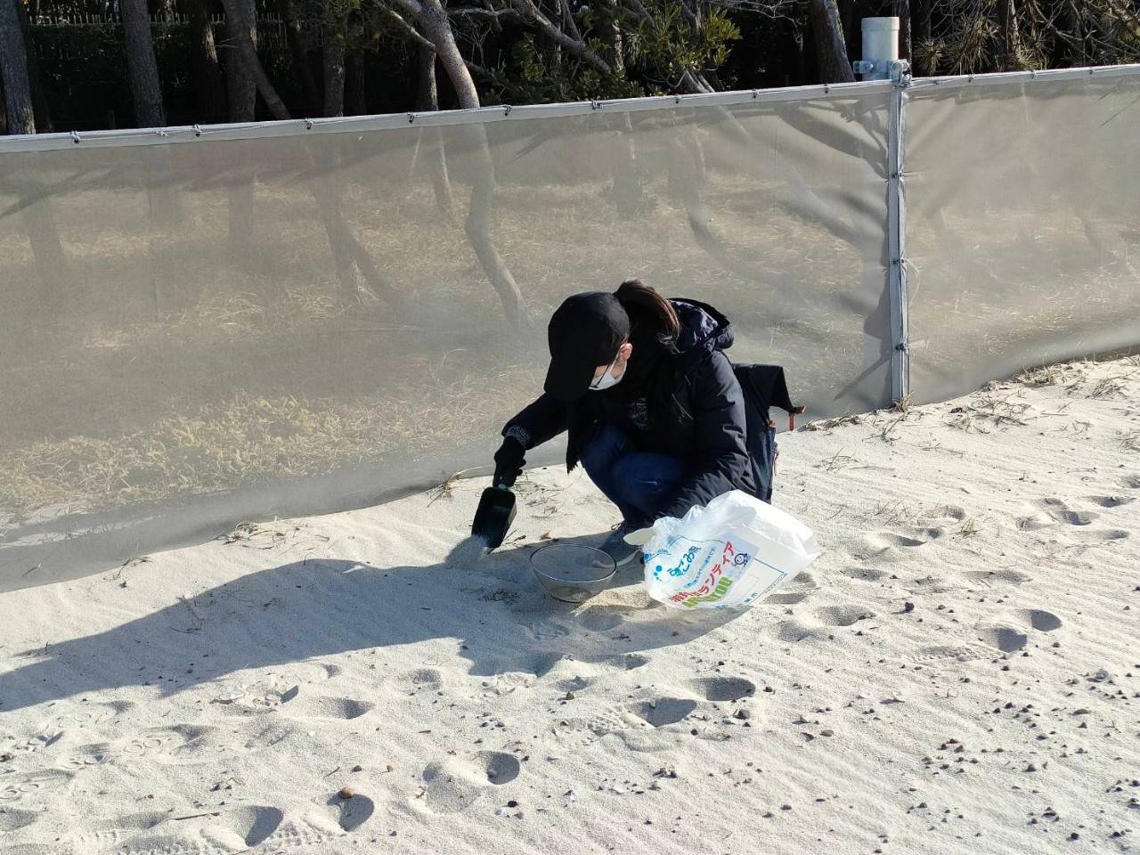 砂浜ではザルを使ってマイクロプラスチックごみ拾い中心の作業をしました。