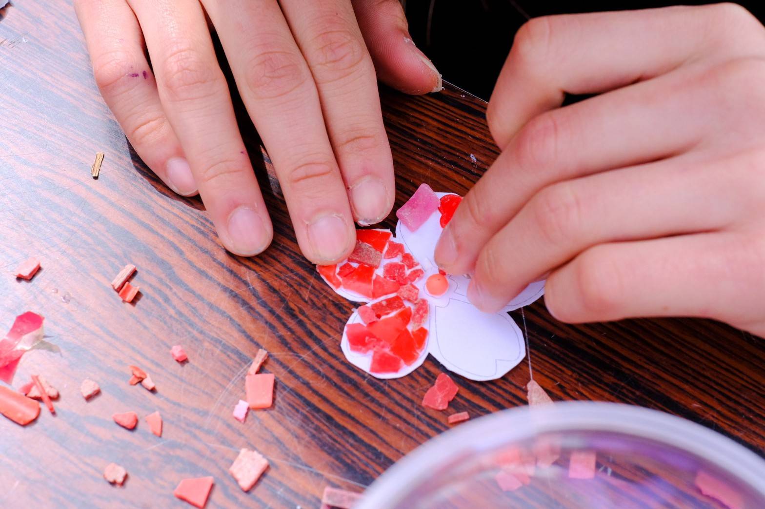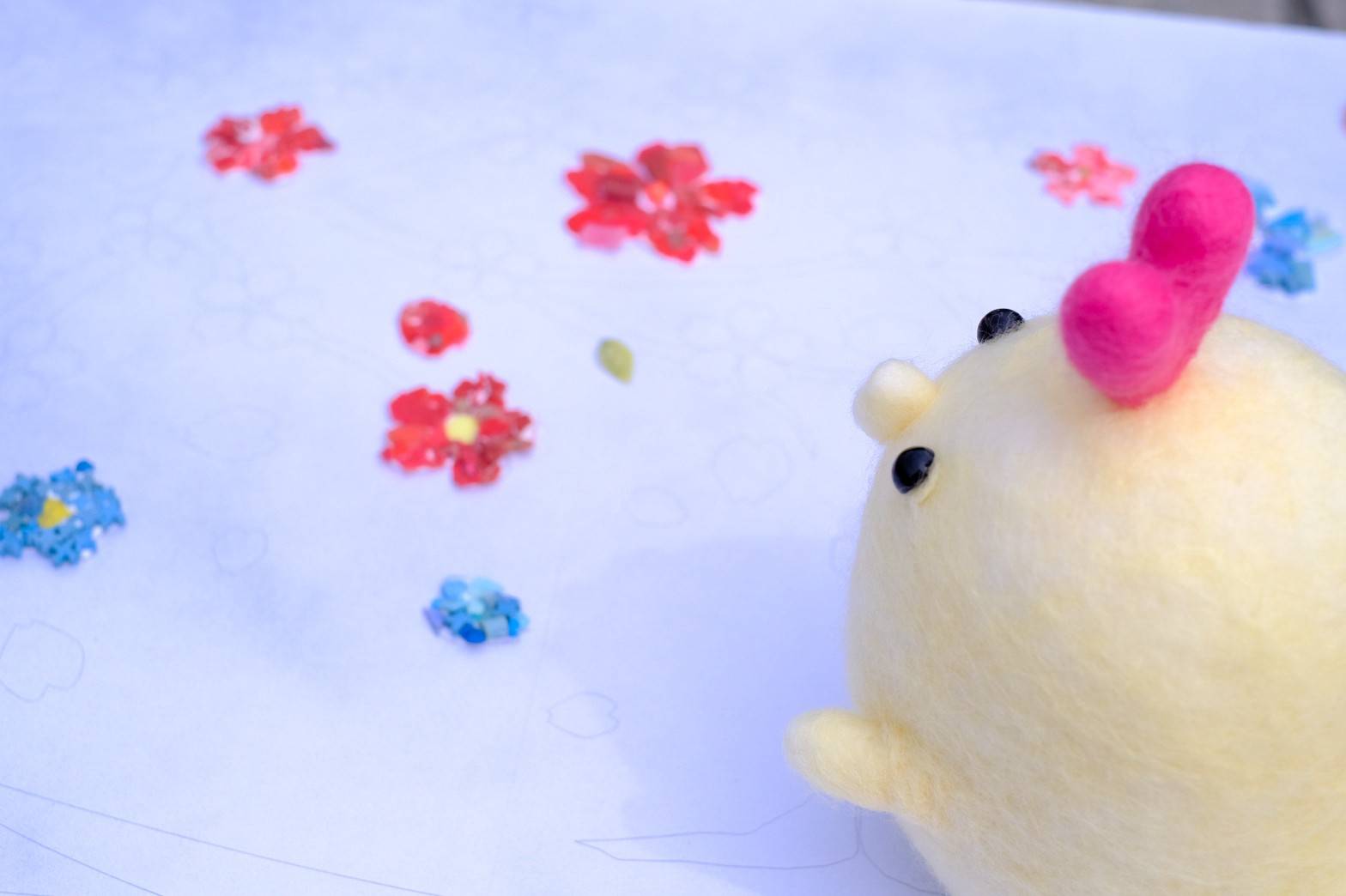 プラごみアート制作では、拾ったプラスチックごみで春らしく桜の花びらを表現しました。