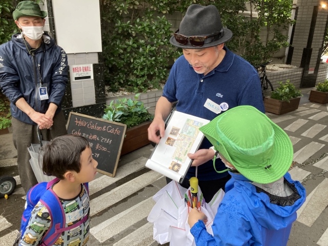 清掃途中に、テレ朝通りに昔あった桜田公園の見取り図を見せながら、おとな隊員が昔の遊びのことや公園の様子を説明してくれました。こども隊員もとても興味深々です。