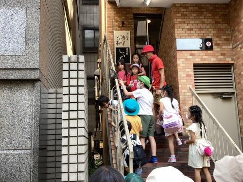紙芝居後にいよいよスタートです。今回のルートは、西麻布三丁目と六本木通りを挟んだ一丁目をぐるりと回るコースです。特にテレビ朝日通りでは、桜田神社やその周辺の再開発前の昭和の家屋が残る地域を清掃しました。途中、桜田神社と桜田門、霞が関と霞町の関係などもクイズで紹介しながら歩きました。