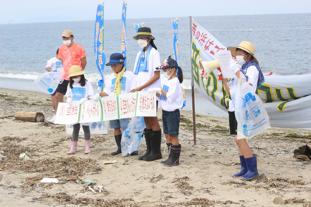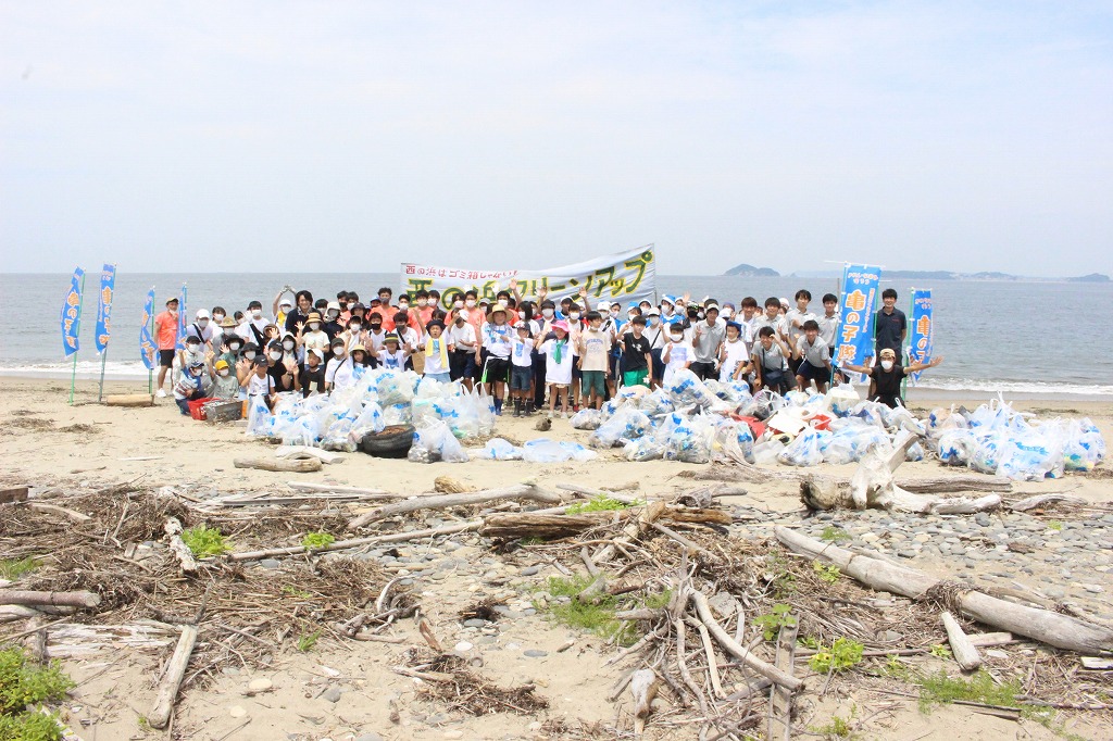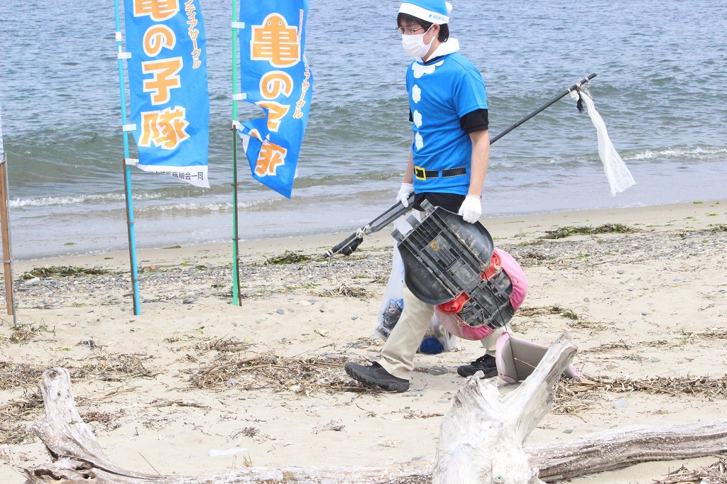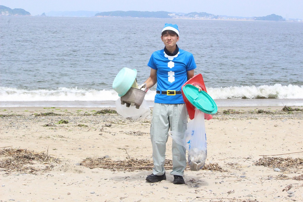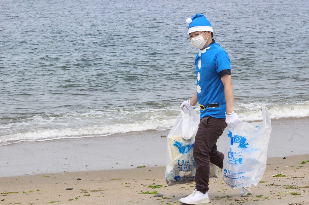 毎月行っている西の浜クリーンアップ活動。今回は、ブルーサンタの活動に参加しました。海の日の祝日ということで、清掃センターが休業のためにゴミの計量ができていませんが、清掃中に集めたペットボトルのキャップの数は1664個。いかにペットボトルが多いかわかります。
