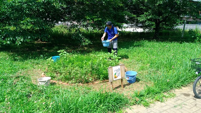 ☆大川小学校からのヒマワリは早渕川の野草に埋もれてましたので、ヒマワリが植わっていることがわかるように、草刈りと水やりを実施しました。大きくなあれ!有り難うございます!