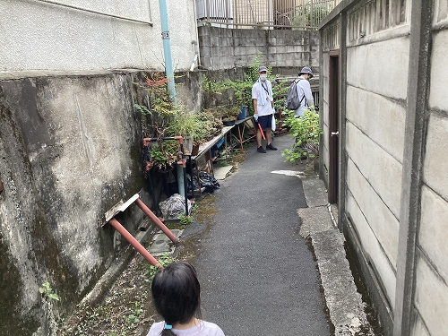 ひとやすみした後は、いよいよ水路のあったと思われる路地を探検しながらのゴミ拾いです。路地のわきの隙間には空き缶が多かったです。