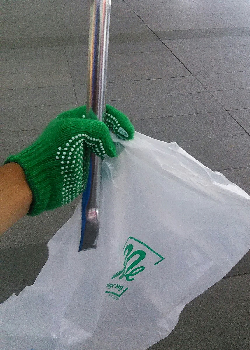 さて、掃除の準備スタイルです。ゴミ袋・トング・軍手・ブルーサンタスタイル、