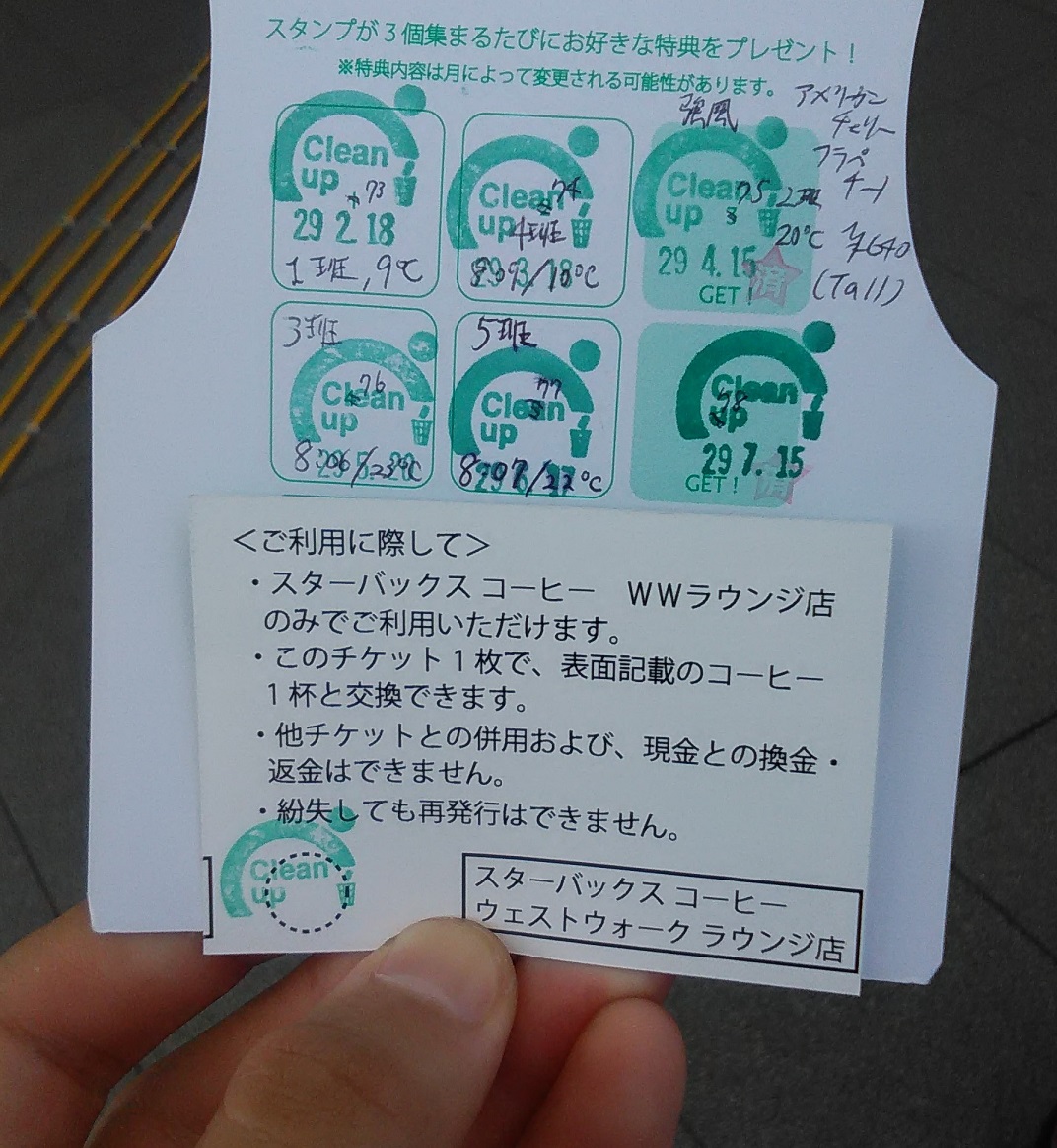 クリーンアップに1回ご参加いただく度に"六本木クリーンアップカード"にスタンプを1つ押します。 スタンプが3つたまると、以下の素敵なプレゼントと交換できます。 ・カフェクレープ クレープ交換券 ・コーヒー交換券(スターバックスさんが提供) ・ツタヤ トウキョウ ロッポンギ レンタル無料券(これはちょっと遠いからもらいにくいです) ・六本木クリーンアップオリジナルキャップ(私は最初にこれをもらいました) ・アカデミーヒルズ ワンデーチケット |