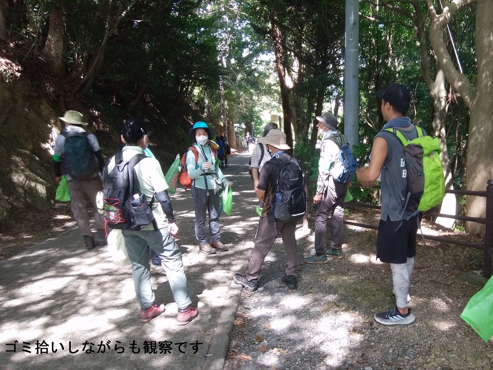 午前中の自然観察では、それぞれのコースで夏の草花と咲き始めた秋の草花を観察しました。琵琶滝コースではオオモクゲンジの黄色い花やイワタバコの紫色の花を、稲荷山コースではウバユリの白い花やフジカンゾウのピンクの花を、吊り橋コースではタマアジサイの薄紫色の花やキジョランの白い花がありました。午後のゴミ拾いでは、飲み干したペットボトルやチケット半券、使い捨てマスクもありました。ゴミを拾いながら、薬王院境内や下山道のフシグロセンノウ、レンゲショウマ、モミジガサ、ヤマホトトギス、ヤブミョウガなどを観察しました。