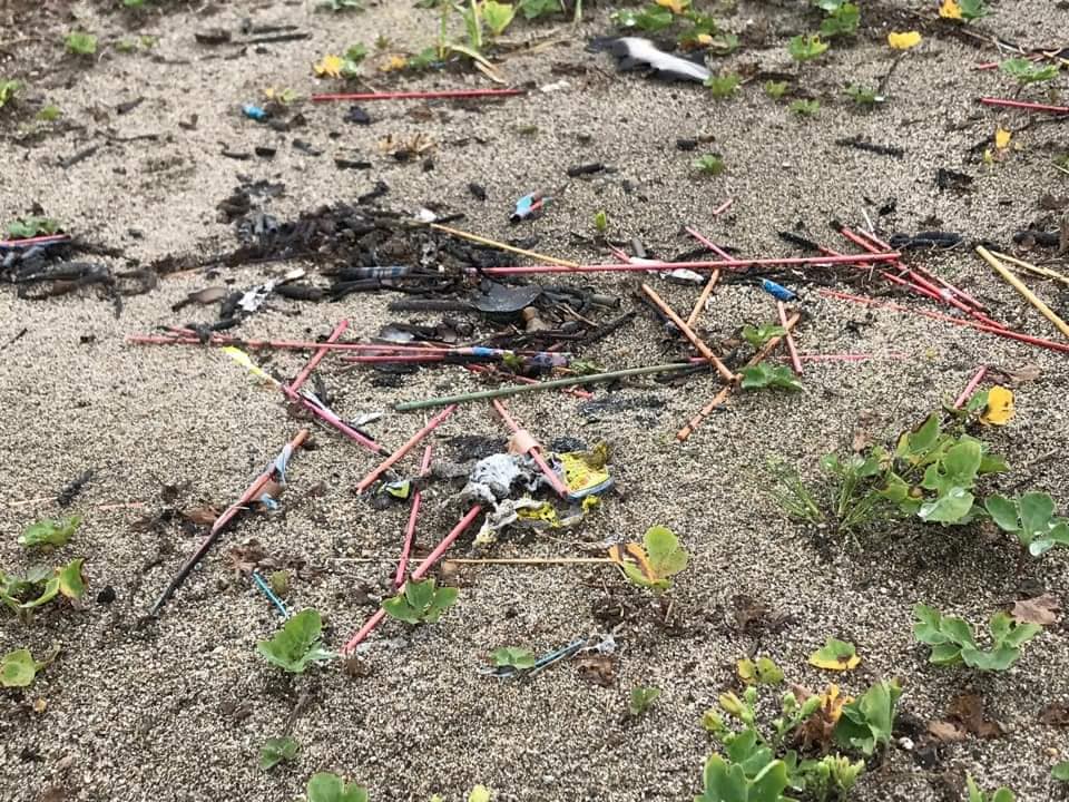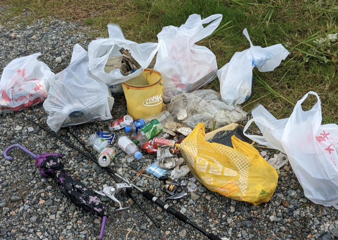 草むらはごみの不法投棄ぽいモノが多く、堤防や浜辺は花火跡やBBQ跡が点在!