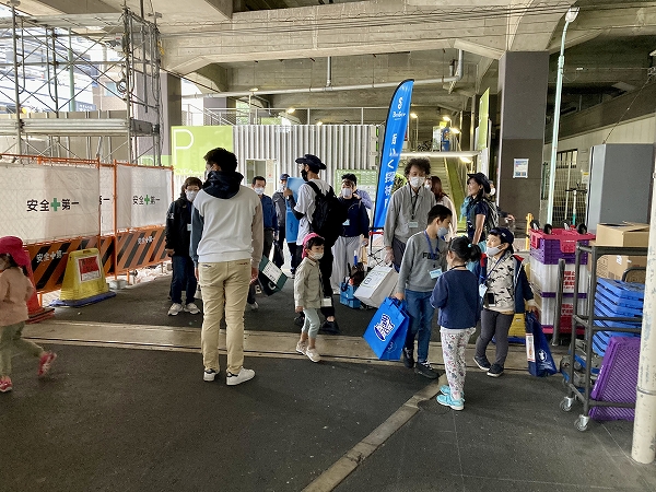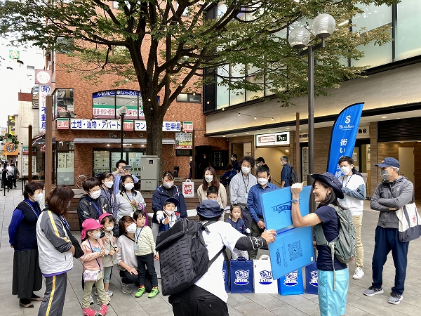 笹塚駅前での活動も3回目を迎え、今回も近くにお住いの親子や、近隣の保育園からも元気な子供たちが参加してくれました。何度も参加してくれているお子さんは慣れたものです。自分の名札を探して、ストラップを身に着けてくれます。街いく探検隊では、参加者はできるだけネームカードを身に着けて、顔と名前が分かるようにしています。受付シーン↓