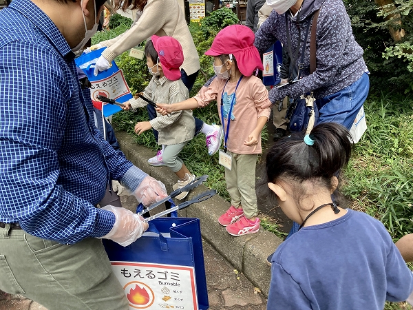 保育士さんと園児たちの連携もお手のもの!いつも安全最優先で安心して活動できます。ありがとうございます。緑道公園のゴミ拾いシーン↓