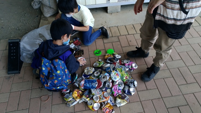 ☆空き缶を分別し始めて2回目、今日は子どもたちが磁石を持ってきてくれて、アルミ缶とスチール缶の分別をしてくれました!子どもたちの仕事、早い!有り難うございます!