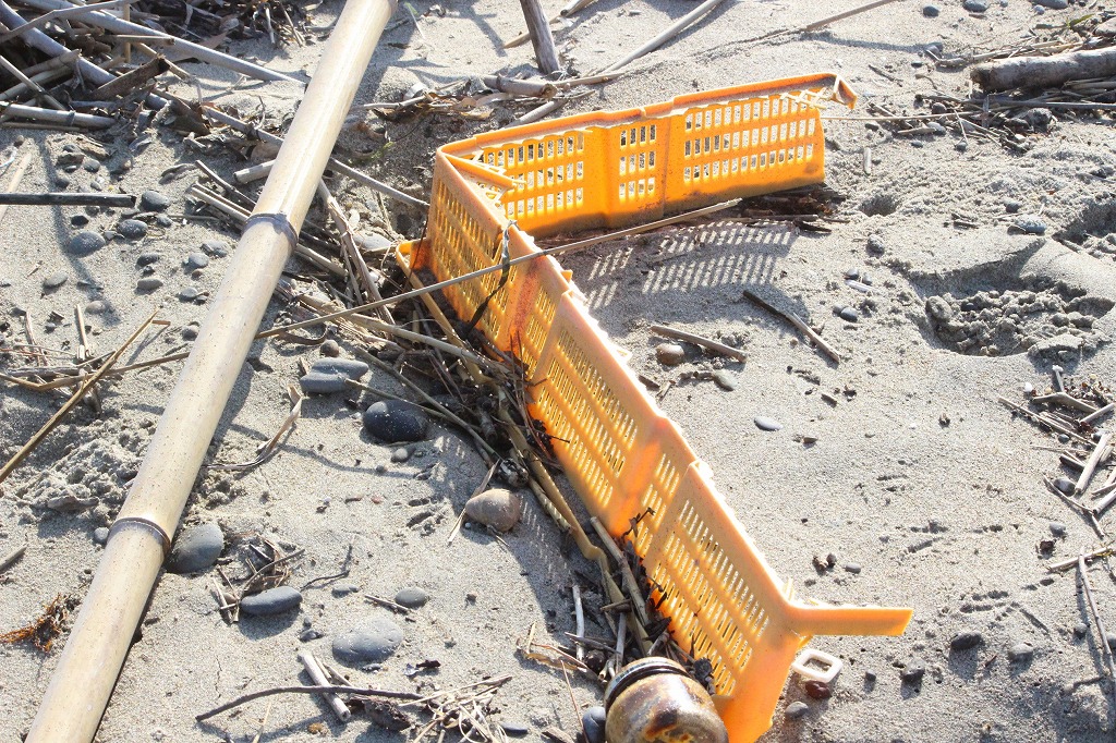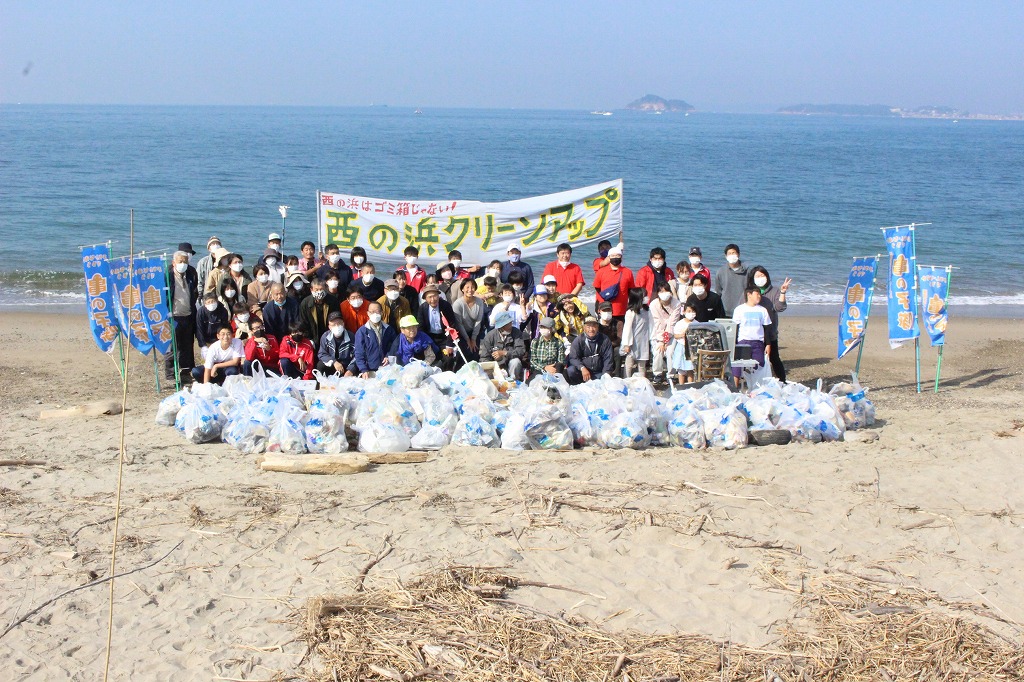 西の浜はボミ箱じゃない!をスローガンに毎月行っている西の浜クリーンアップ活動。ゴミ総重量は290Kg。キャップの数は829個