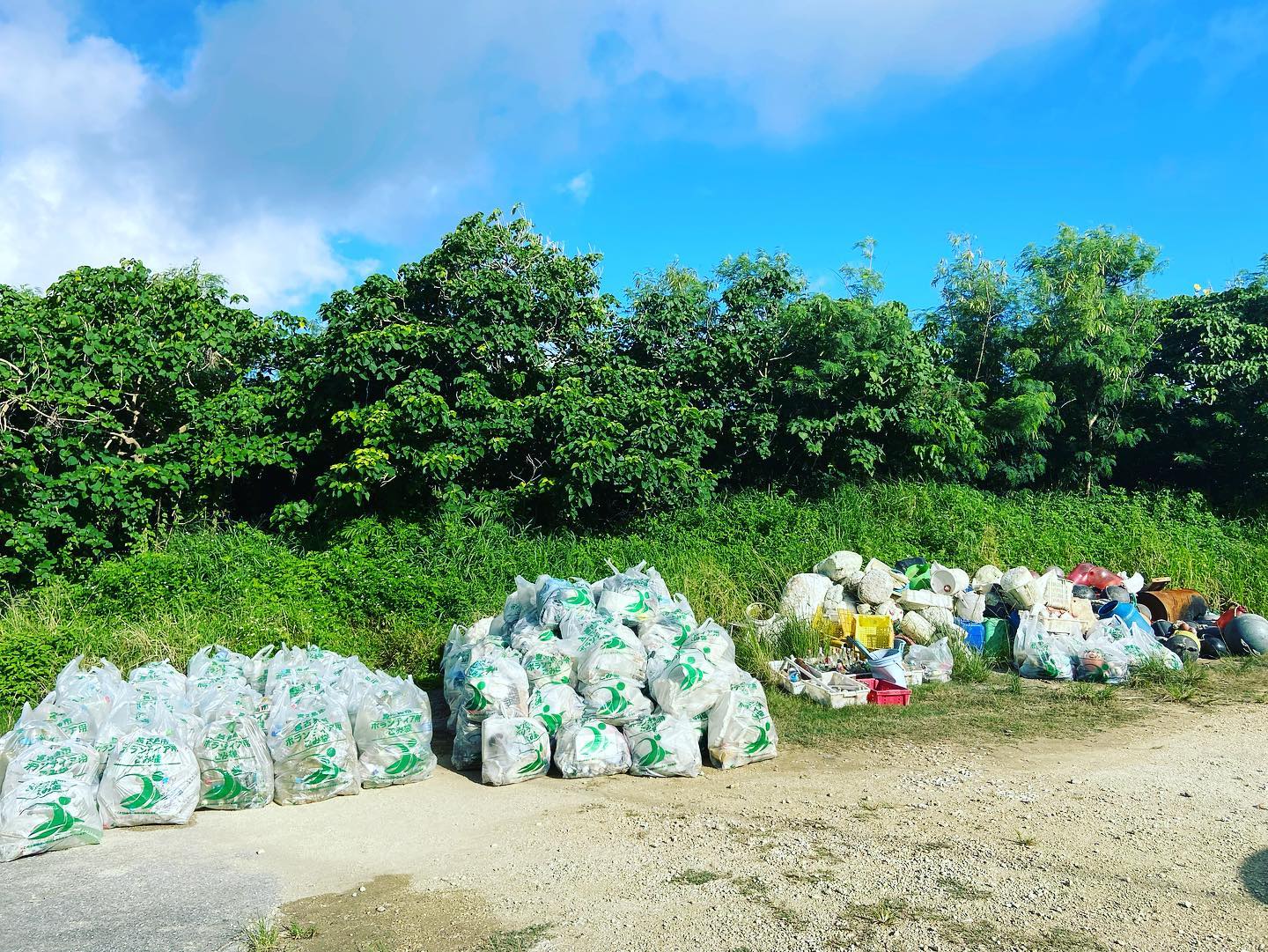 ・燃えるゴミ96袋、ペットボトル56袋、ビン3箱、カン1袋、丸ブイ62個、漁具7袋、蛍光灯、ライター39個、注射器1本