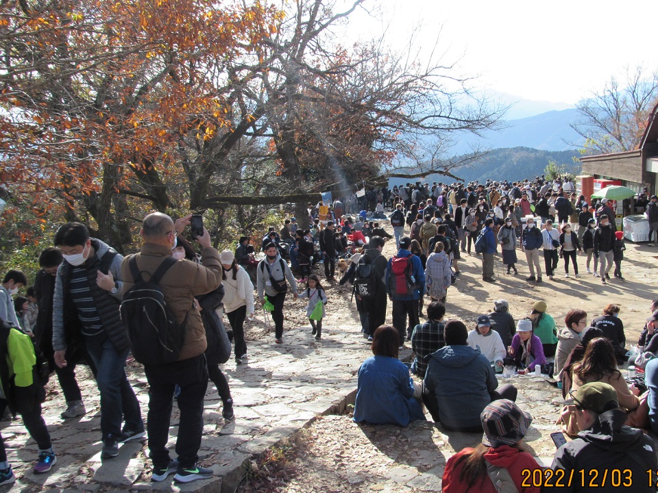 《大賑わいの高尾山頂で緑のボランティア袋を持って親子でゴミを拾いました》