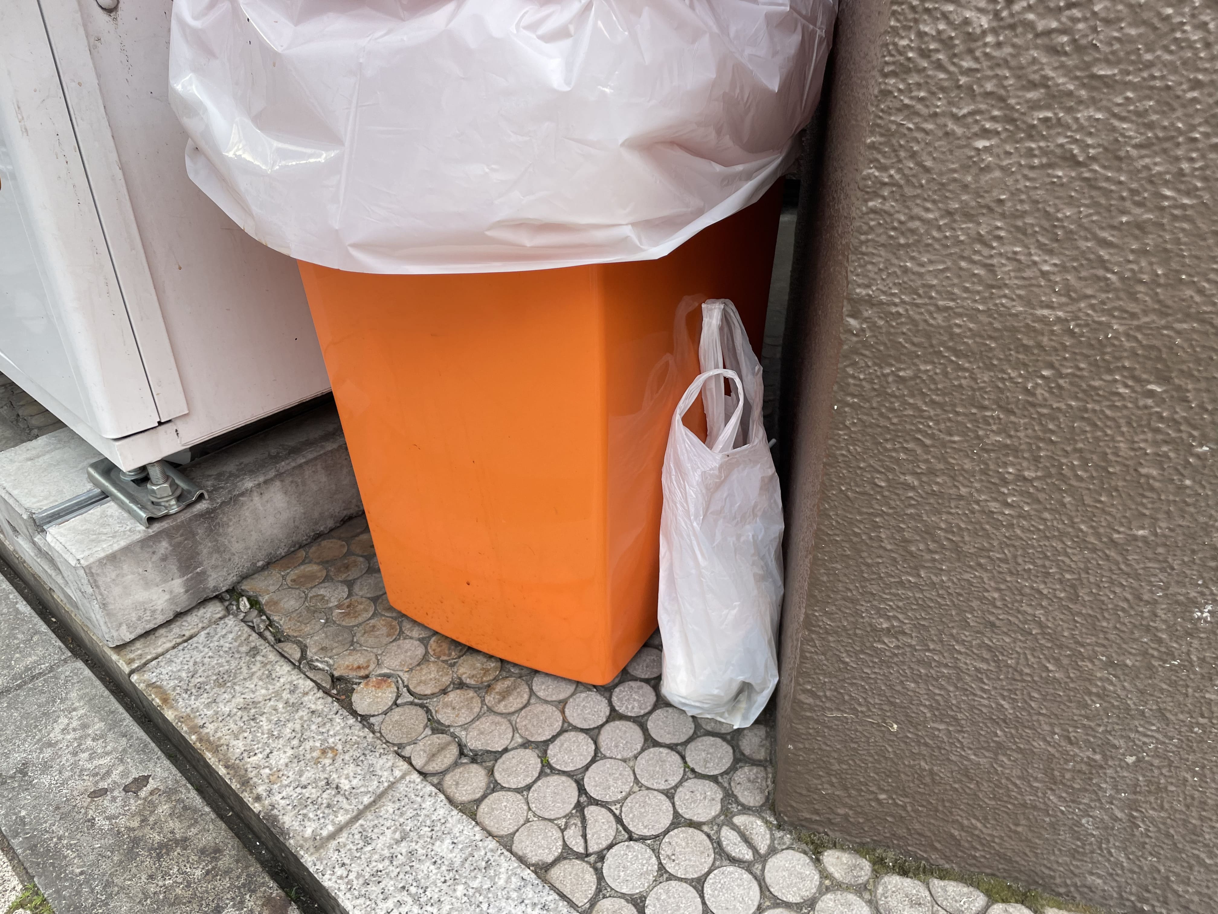 大通り沿いを歩いていると、大物を発見。お弁当のゴミがまとまった袋が缶用ゴミ箱のわきにそっと置いてありました。