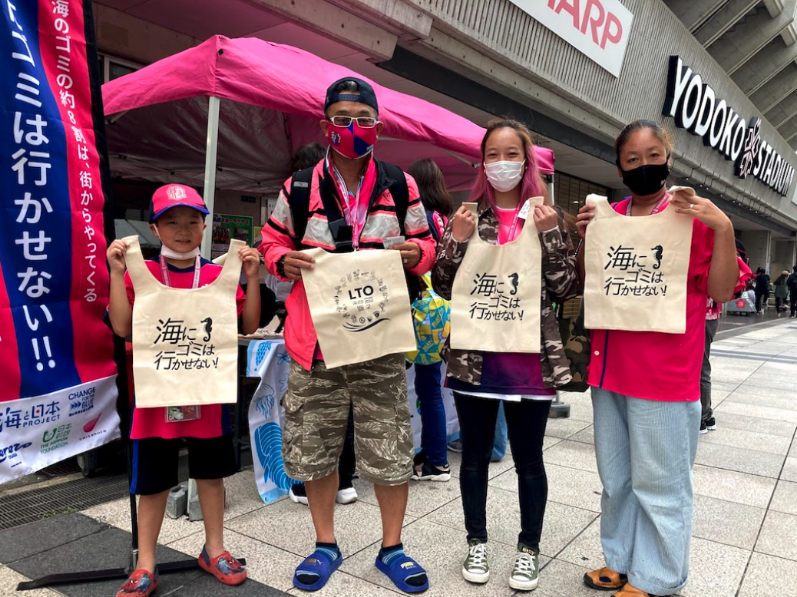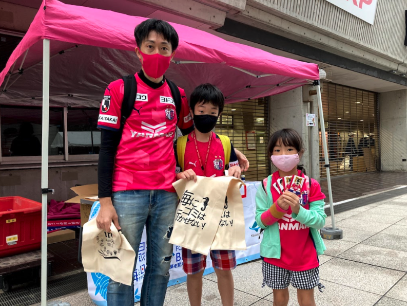 試合終了直後に雨が降り出し、ごみの収集活動は急遽取りやめとなりましたが、LTOカードと春のキャンペーン時にお配りできなかったトートバックの配布を行いました。